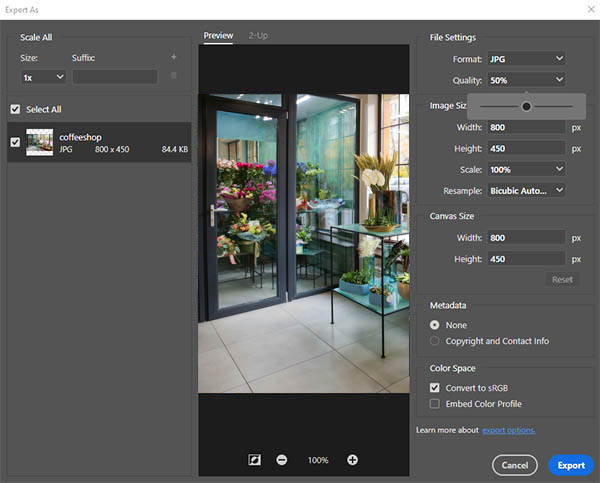 You’ll see a preview of your image, where you can use the + and icons to adjust your image to 100 percent. Under File Settings on the right, you should check that Format is set to JPG.