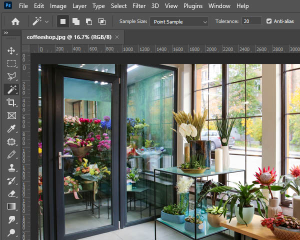 Let’s assume that there’s a photo of a florist’s boutique that we want to put up on a website. When loaded into Photoshop, this image might look something like this: