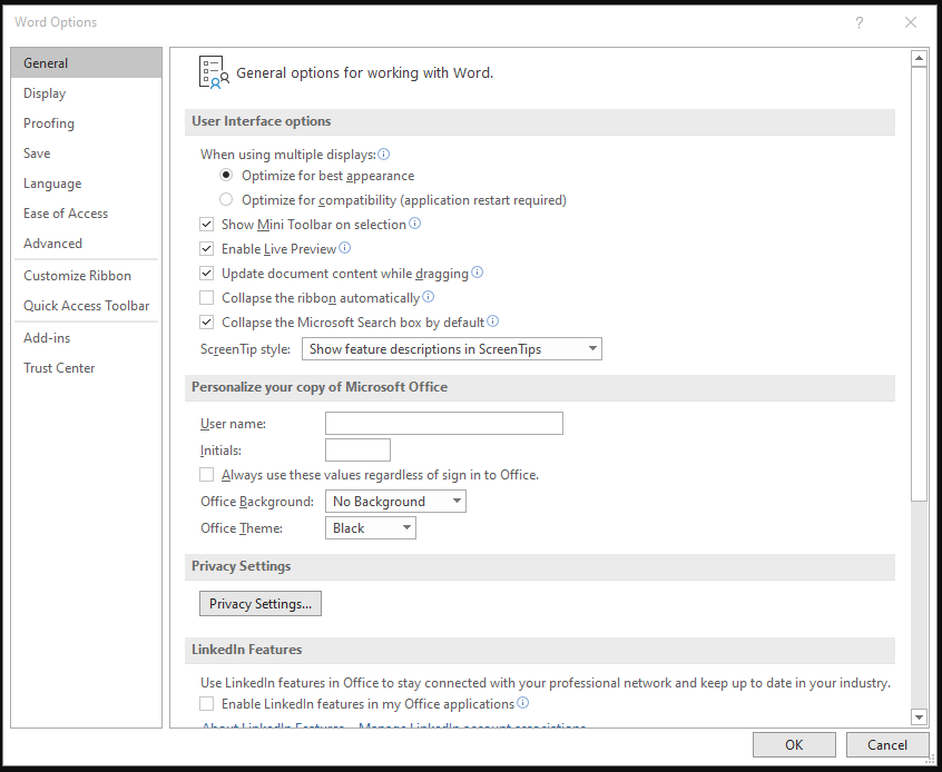 Once you have opened Word, click on File, and navigate to Options. Under the tab labelled General, find Personalize your copy of Microsoft Office. There, you’ll find the option to switch Office Theme to Black.
