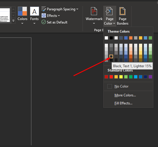 In the tool ribbon at the top of Microsoft Word, find the Design tab and locate Page Color. If you can’t find it, try clicking on the Magnifying Glass at the top-right of Word, and search for Page Color there.