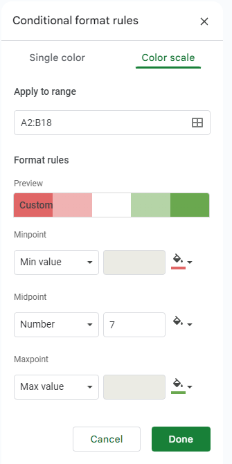 Once the Conditional format rules window opens, select + Add another rule and then select Color scale.